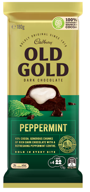 Experience the timeless, refreshing combination of rich dark chocolate and cool peppermint with Cadbury Old Gold. This 180g block features Cadbury’s signature smooth, intense Old Gold dark chocolate, carefully enveloping a layer of crisp, cool peppermint fondant. It’s the perfect balance of deep cocoa bitterness and a bright, refreshing minty sweetness that cleanses the palate.